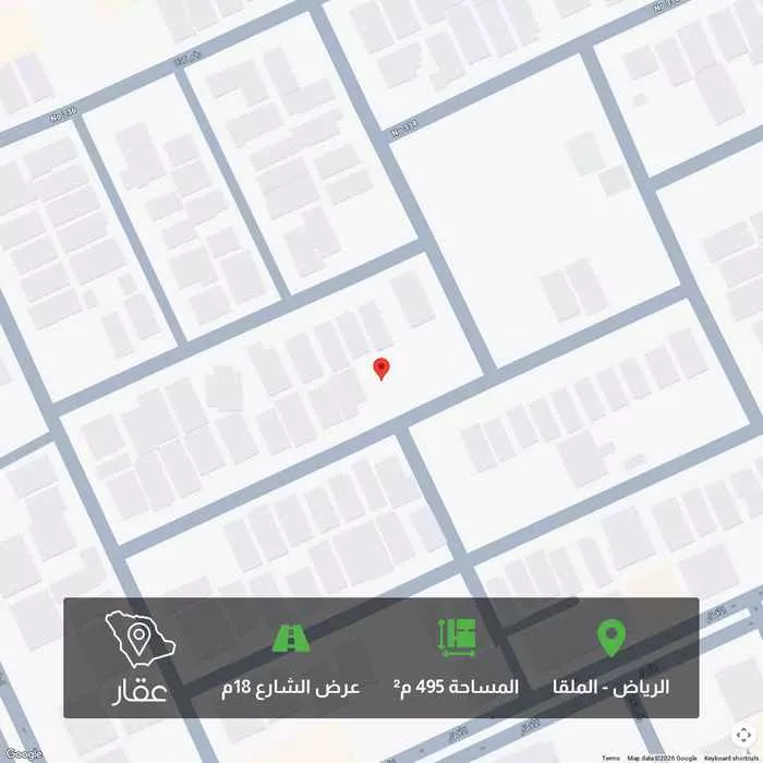 عرض على Aqarللبيع ارض في حي الملقا 495 متر في موقع مميز الاطوال 16.50 في 30 شارع 20 جنوبي