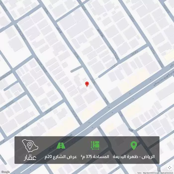375 م² أرض في ظهرة البديعة، الرياض معروضة بسعر ٩٧٥٬٠٠٠ ريال، أقل بنسبة 4% من متوسط سعر الحي البالغ ١٬٠١٢٬٥٠٠ ريال. بناءً على 16 عقار مشابه.
