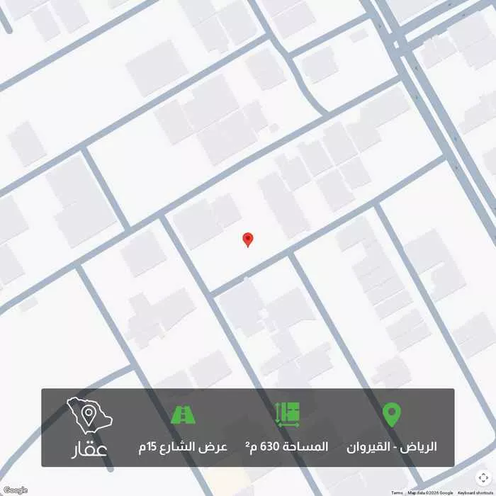 630 م² أرض في القيروان، الرياض معروضة بسعر ٢٬٣٣١٬٠٠٠ ريال، أقل بنسبة 31% من متوسط سعر الحي البالغ ٣٬٣٧٥٬٠٠٠ ريال. بناءً على 212 عقار مشابه.