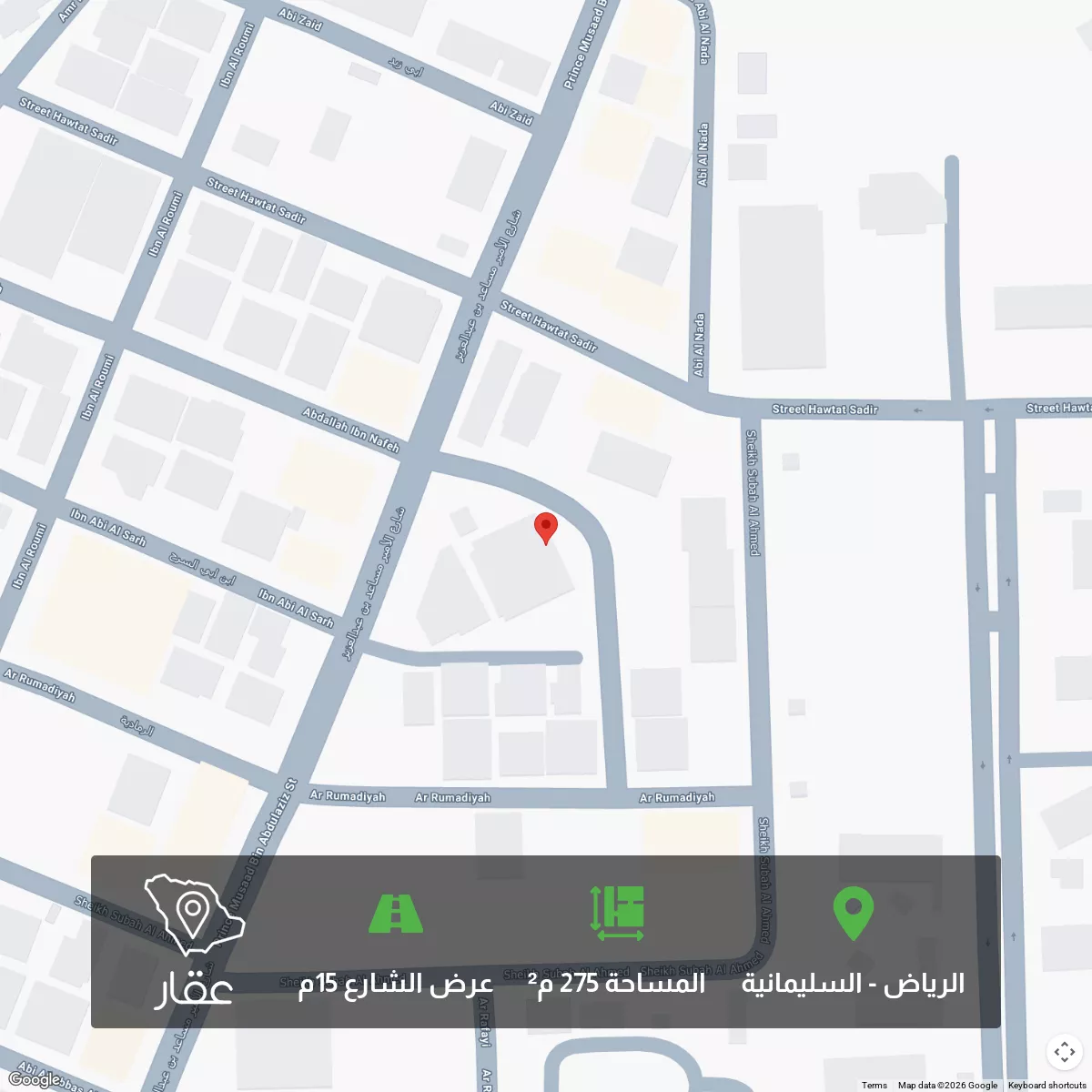 عرض على Aqarللبيــــــــع قطعة ارض سكنيه حي السليمانيه قريبه من مستشفى العسكري المساحة ٢٧٥م شارع ١٥م شمالى الأطوال ١١ × ٢٥ عمق حد البيــــــــــــــــع ٨٠٠٠ يوجد رخصة بناء جاهزة