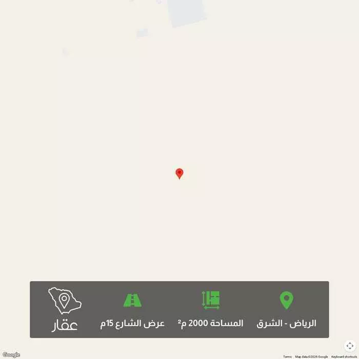 2000 م² أرض في الشرق، الرياض معروضة بسعر ١٬٠٠٠٬٠٠٠ ريال، أعلى بنسبة 67% من متوسط سعر الحي البالغ ٥٩٨٬٩٥٠ ريال. بناءً على 650 عقار مشابه.