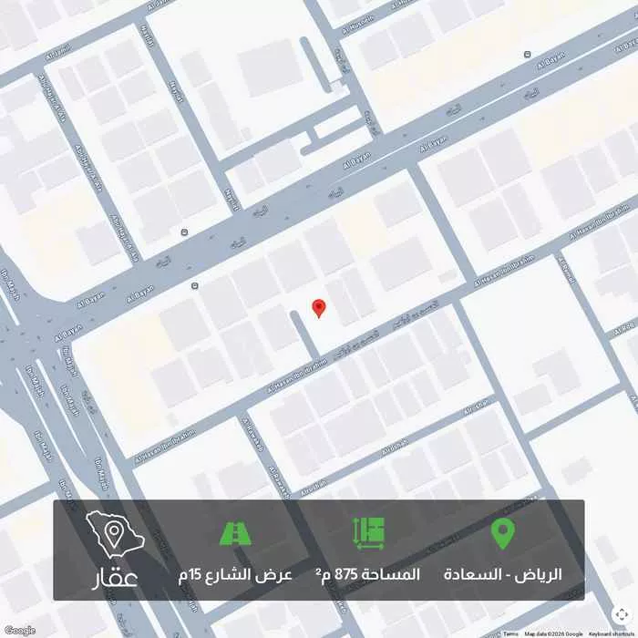 عرض على Aqarللبيع ارض سكنيه المساحة : 875 متر عرض الشارع : 15 متر الواجهه : جنوبية الاطوال : 35*25