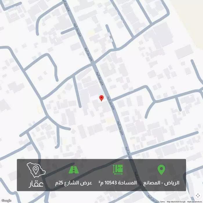 عرض على Aqarللبيع ارض بصك في حي المصانع جنوب الرياض بمساحة 10,543 م، شرقية شارع ٢١ م، وشمالاً وغرباً شارع ٦ م. عليها استراحات ٢٥ استراحة، ويوجد بها ٣ عدادات كهرباء و ٤ عدادات ماء وارتوازين ماء عذب. منطقة مزارع وا...