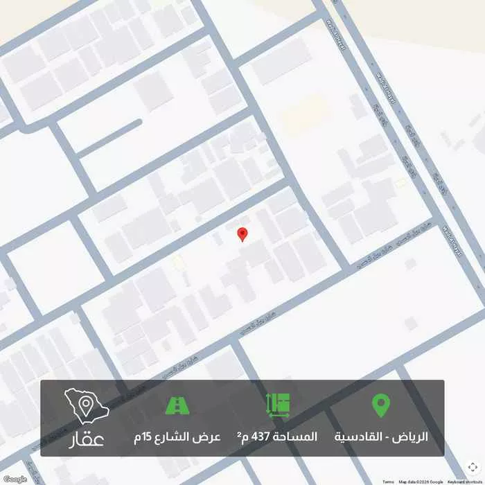 عرض على Aqarللبيع أرض سكنية – حي القادسية • واجهة شمالية • شارع عرض 15 متر • مساحة 437.5 م² • الأبعاد: 12.50 م × 35 م موقع مميز وقريبة من الخدمات