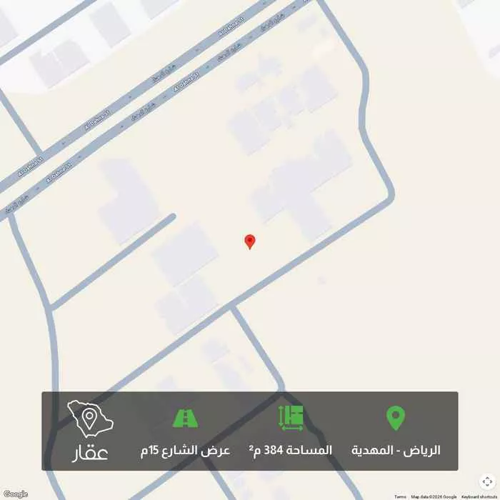 384 م² أرض في المهدية، الرياض معروضة بسعر ١٬٧٢٨٬٠٠٠ ريال، أقل بنسبة 6% من متوسط سعر الحي البالغ ١٬٨٣٩٬٨٤٠ ريال. بناءً على 364 عقار مشابه.