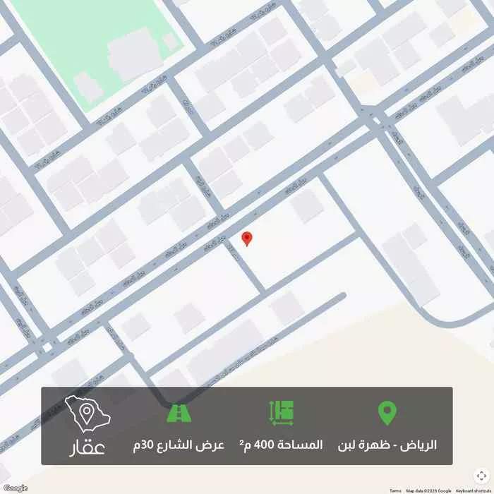 400 م² أرض في ظهرة لبن، الرياض معروضة بسعر ١٬٥٠٠٬٠٠٠ ريال، أقل بنسبة 39% من متوسط سعر الحي البالغ ٢٬٤٧٥٬٠٠٠ ريال. بناءً على 266 عقار مشابه.