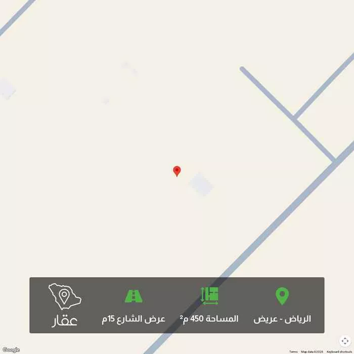 450 م² أرض في عريض، الرياض معروضة بسعر ٥٤٠٬٠٠٠ ريال، أعلى بنسبة 35% من متوسط سعر الحي البالغ ٣٩٩٬٦٠٠ ريال. بناءً على 653 عقار مشابه.