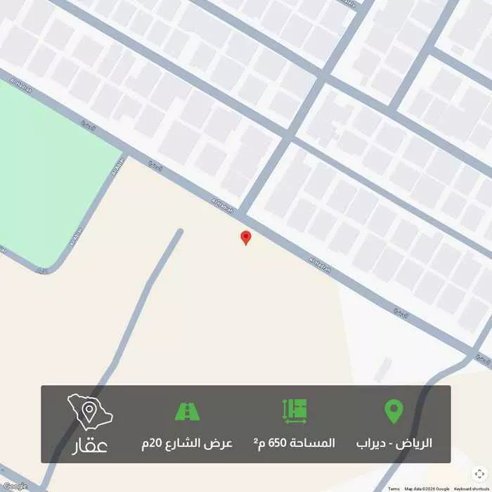 عرض على Aqarأرض للبيع – استخدام سكني المساحة الإجمالية: 650 متر مربع الواجهة: شمالية شرقية على شارع عرض 20 متر. الحدود والأطوال: ◦شمالاً: شارع عرض 20 م بطول 25 م. ◦جنوباً: جار بطول 25 م. ◦شرقاً: شارع عرض 15 م بطو...