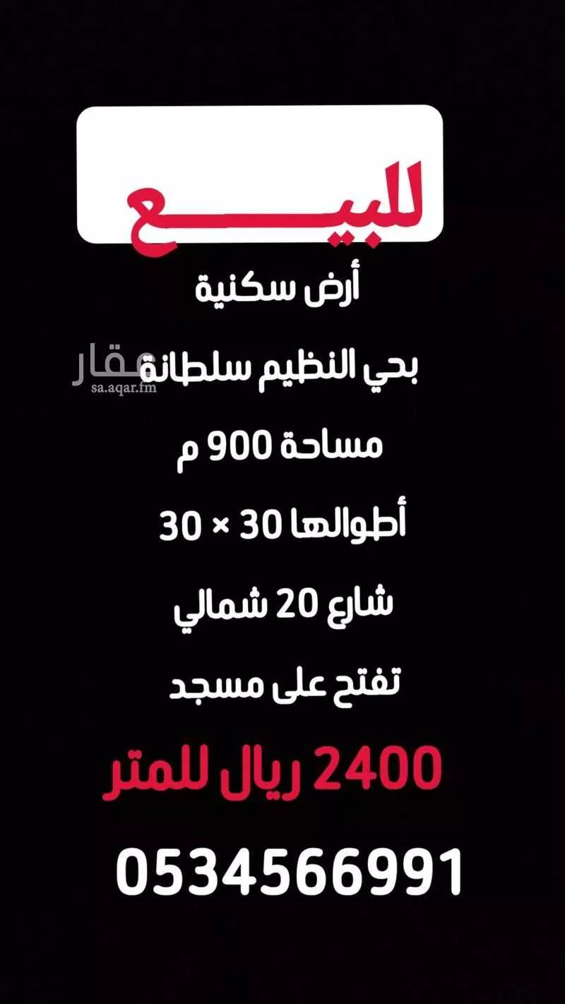 عرض على Aqarللبيــــــــع أرض سكنية في حي النظيم سلطانة مساحة 900 م شارع 20 شمالي أطوالها 30 × 30 السعر 2400 ريال للمتر للتواصل والاستفسار : 0534566991 0551090062 مكتب درة الرايــة للعقارات