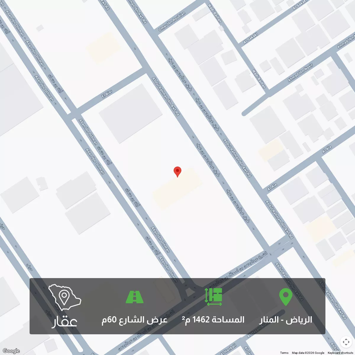 عرض على Aqarارض تجارية مميزة للبيع حي المنار المساحة 1462 م شارع 60 شرقي شارع 40 غربي الطول على الشارع 22.5 م - العمق 65 م البيع : 8.770.000 ريال صافي للتواصل : 0552621919