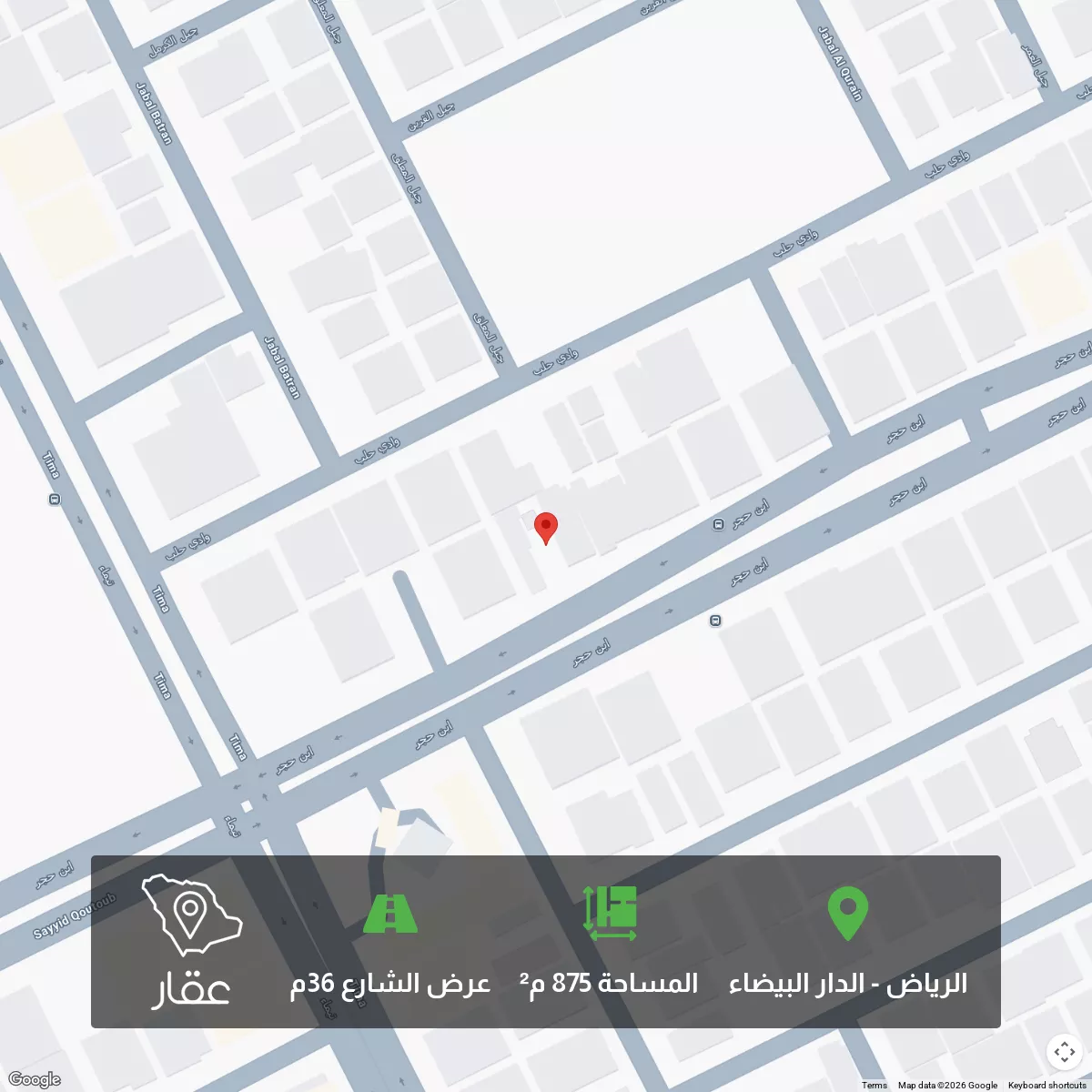 875 م² أرض في الدار البيضاء، الرياض معروضة بسعر ٢٬٣٥٢٬٠٠٠ ريال، أعلى بنسبة 70% من متوسط سعر الحي البالغ ١٬٣٨٧٬٥٠٠ ريال. بناءً على 40 عقار مشابه.
