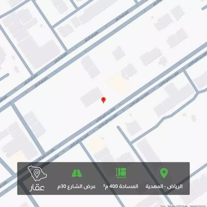 400 م² أرض في المهدية، الرياض معروضة بسعر ٢٬٤٠٠٬٠٠٠ ريال، أعلى بنسبة 30% من متوسط سعر الحي البالغ ١٬٨٣٩٬٨٤٠ ريال. بناءً على 364 عقار مشابه.