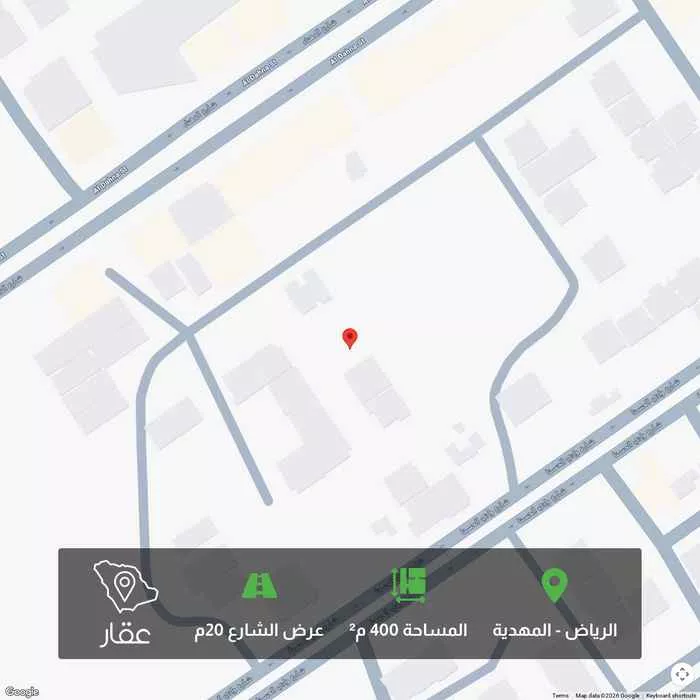 عرض على Aqarارض للبيع حي المهـدية - الرياض على شارعين شارعها الشرقي يفتح على حديقة - المساحه : 400م الشارع : 20م - 10م الواجهه : جنوبي - شرقي - السعر 1,970,000﷼ المالك معي مباشره المسوق العقاري : فواز الحارثي وات...