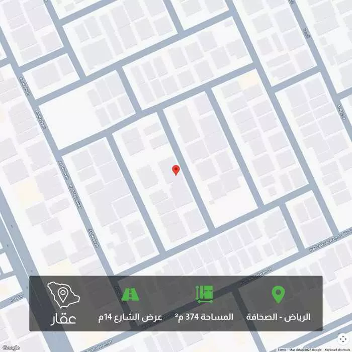 عرض على Aqarمعلومات الأرض طبقا للصك نوع العقار : ارض فضاء / سكني الموقع : حي الصحافة مساحة العقار : 374.4 م2 عرض الشارع : 14م رقم المخطط : 1637/ س واجهة العقار : شرقية خدمات العقار : كل الخدمات حدود وأطوال الأرض ...