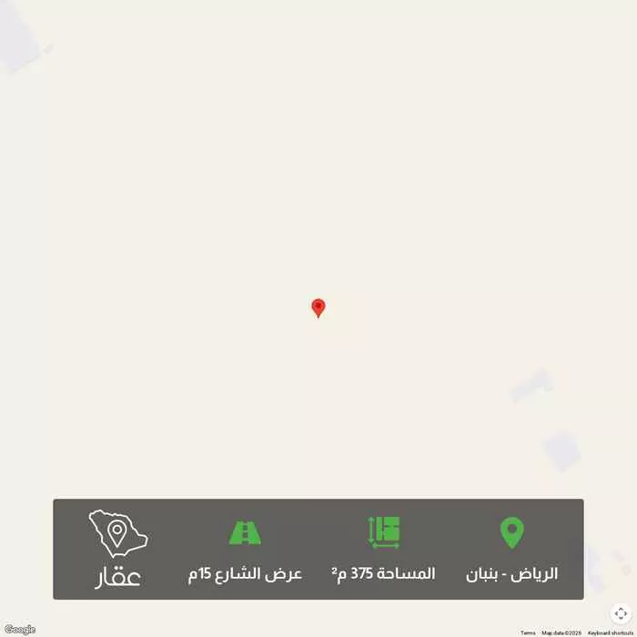 375 م² أرض في بنبان، الرياض معروضة بسعر ٥٥٠٬٠٠٠ ريال، أقل بنسبة 32% من متوسط سعر الحي البالغ ٨٠٤٬٥٦٢٫٥ ريال. بناءً على 944 عقار مشابه.