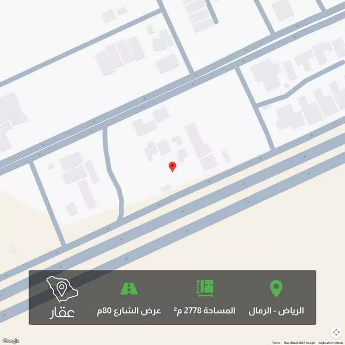 2778 م² أرض في الرمال، الرياض معروضة بسعر ٢٠٬٨٣٥٬٠٠٠ ريال، أعلى بنسبة 768% من متوسط سعر الحي البالغ ٢٬٤٠٠٬٠٠٠ ريال. بناءً على 270 عقار مشابه.