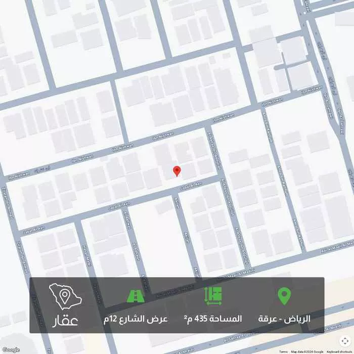 435 م² أرض في عرقة، الرياض معروضة بسعر ٣٬٠٠٠٬١٩٥ ريال، أقل بنسبة 28% من متوسط سعر الحي البالغ ٤٬١٨٠٬٤٨٠ ريال. بناءً على 60 عقار مشابه.