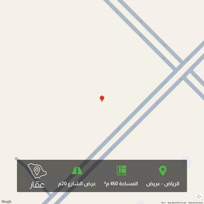 450 م² أرض في عريض، الرياض معروضة بسعر ٤٠٠٬٠٥٠ ريال، بنفس متوسط سعر الحي البالغ ٣٩٩٬٦٠٠ ريال. بناءً على 653 عقار مشابه.
