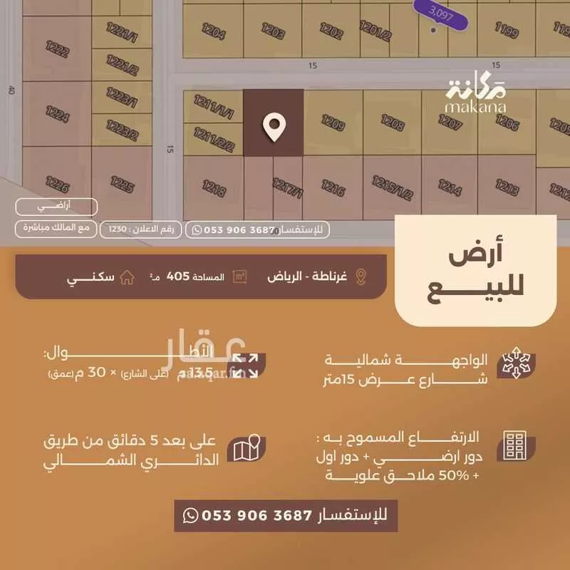 عرض على Aqarأرض للبيع - حي غرناطة - كود رقم 1230 ــ عقارات من مكانة مباشرة مع المالك ــ •أرض للبيع حي غرناطة - الرياض الاستخدام: سكني المساحة: 405 م² ▪ واجهة شمالية شارع عرض 15 م ▪ الاطوال : 13.5م على الشارع * 30...