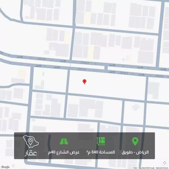 عرض على Aqarارض للبيع حي طويق نمار شارع الذهبي مساحة ٨٤٠ متر شارعين متظاهره شارع ٤٠ متر شمالي وشارع ١٤ متر جنوبي البيع 3100 للمتر على شور شركة بالاس العقارية