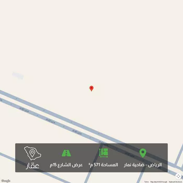 571 م² أرض في ضاحية نمار، الرياض معروضة بسعر ٤٨٠٬٠٦٠ ريال، أقل بنسبة 36% من متوسط سعر الحي البالغ ٧٥٠٬٠٠٠ ريال. بناءً على 439 عقار مشابه.