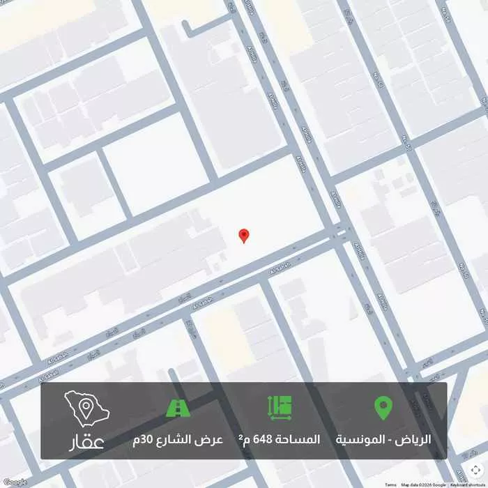 648 م² أرض في المونسية، الرياض معروضة بسعر ٤٬٥٣٦٬٠٠٠ ريال، أعلى بنسبة 23% من متوسط سعر الحي البالغ ٣٬٦٧٥٬٠٠٠ ريال. بناءً على 57 عقار مشابه.