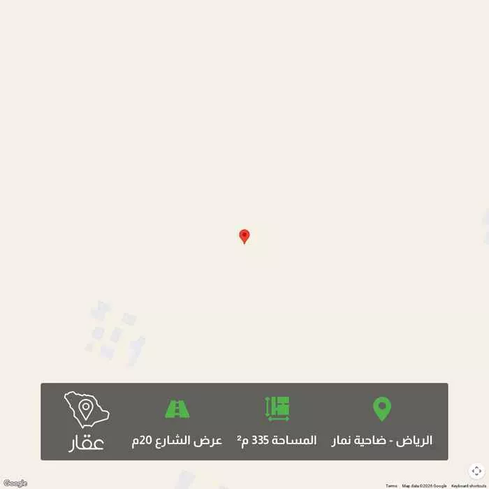 335 م² أرض في ضاحية نمار، الرياض معروضة بسعر ٧٥٠٬٠٠٠ ريال، بنفس متوسط سعر الحي البالغ ٧٥٠٬٠٠٠ ريال. بناءً على 439 عقار مشابه.