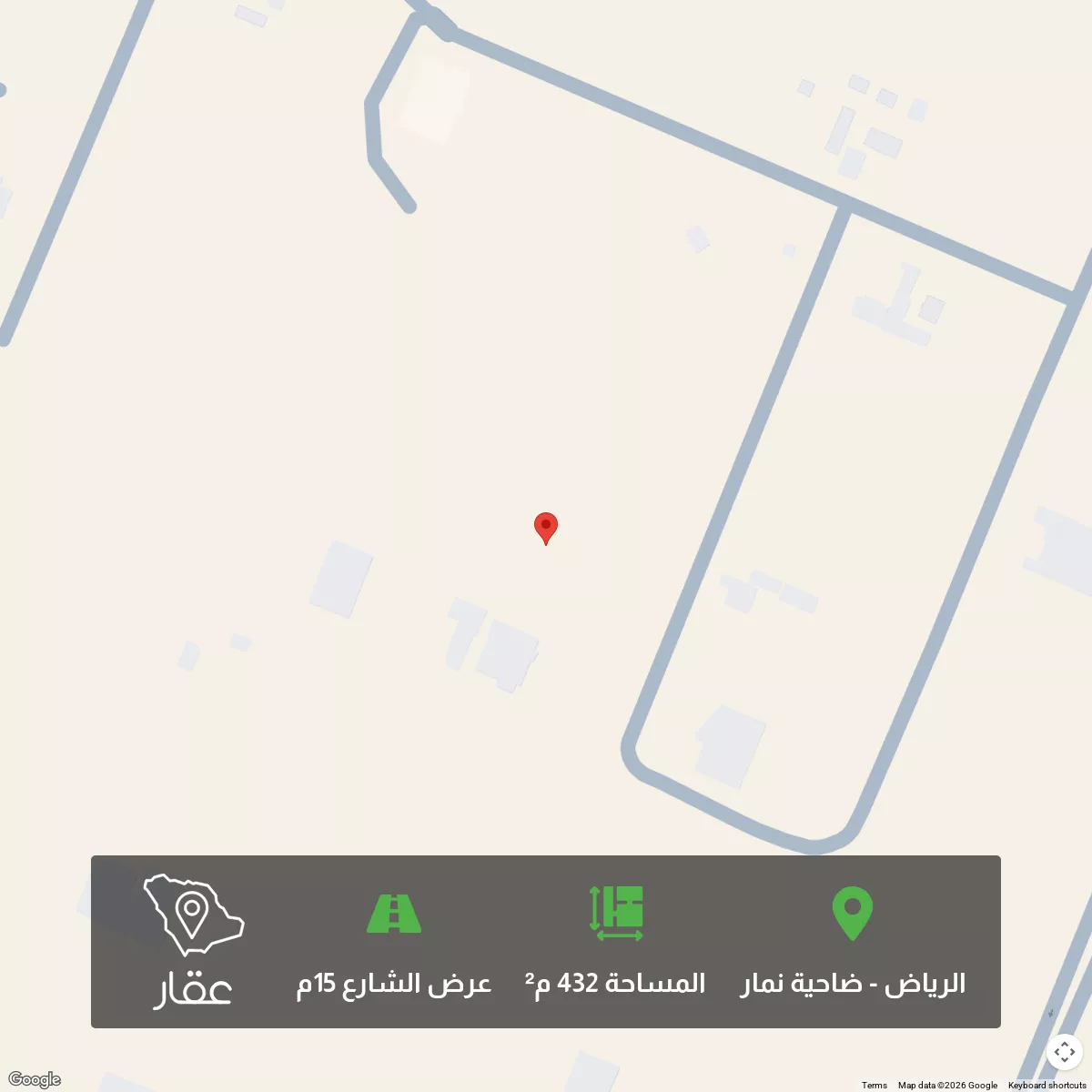 432 م² أرض في ضاحية نمار، الرياض معروضة بسعر ٥٬٨٥٣٬٦٠٠ ريال، أعلى بنسبة 680% من متوسط سعر الحي البالغ ٧٥٠٬٠٠٠ ريال. بناءً على 439 عقار مشابه.