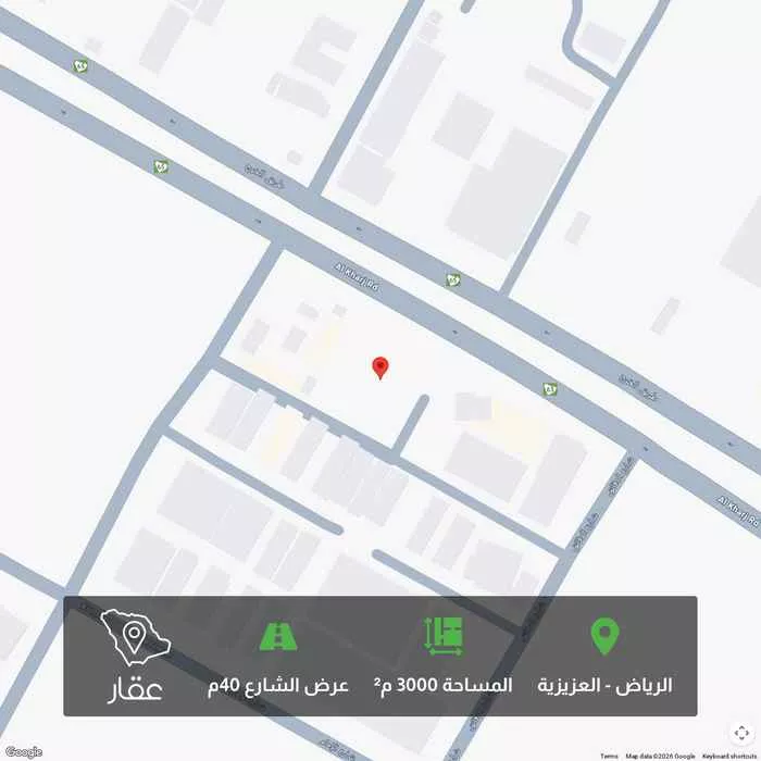 عرض على Aqarللبيع أرض تجارية بحي العزيزية المساحة: ٣٠٠٠ م² الأبعاد: ٥٠ متر عرض × ٦٠ متر عمق الواجهة: شمالية على شارع تجاري عرض ٤٠ متر الموقع: على طريق الخرج القديم شارع ٤٠، بجانب مشروع مدرسة دلة لتعليم القيادة، و...