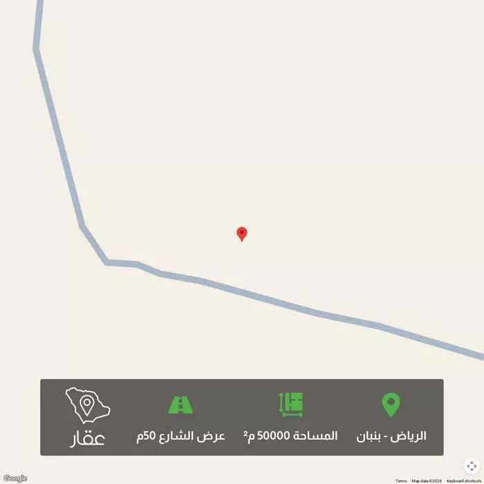 50000 م² أرض في بنبان، الرياض معروضة بسعر ٢٢٬٥٠٠٬٠٠٠ ريال، أعلى بنسبة 2697% من متوسط سعر الحي البالغ ٨٠٤٬٥٦٢٫٥ ريال. بناءً على 944 عقار مشابه.