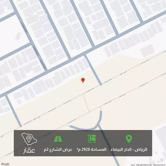 عرض على Aqarارض على شارع الياقوت الدار البيضا شارع : ٦٠ م المساحة : 2,928.51 الأطوال : 75 م على الشارع عمق 39 م الارض على شارعين :60 م و 10 م ممكن المشتري يقدر يطلع عليها تصريح محطه والله اعلم لان الشروط منطبقه ع...