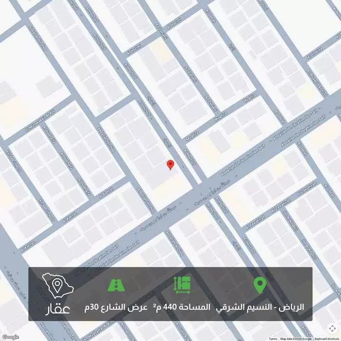 440 م² أرض في النسيم الشرقي، الرياض معروضة بسعر ١٬٥٠٠٬٠٠٤ ريال، أقل بنسبة 25% من متوسط سعر الحي البالغ ١٬٩٨٧٬٥٠٠ ريال. بناءً على 11 عقار مشابه.
