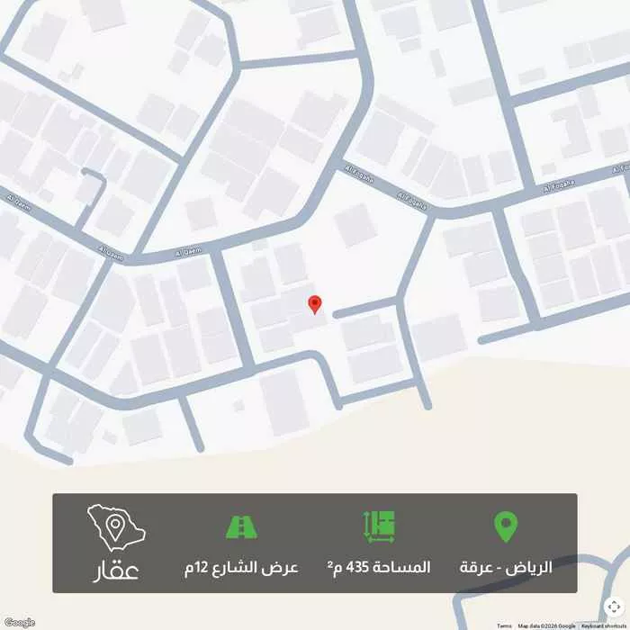 عرض على Aqarللبيع أرض سكنية مميزة – حي عرقة، الرياض فرصة ذهبية لامتلاك أرض في واحد من أرقى أحياء غرب الرياض، بمواصفات مثالية ومستندات معتمدة من اللجنة الفنية. المساحة: 435م² مخطط 2811 – قطعة رقم 277 شارع جنوبي بع...