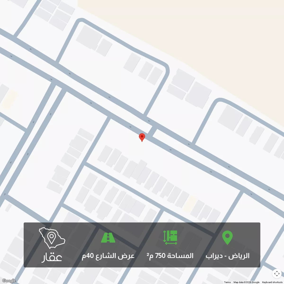 750 م² أرض في ديراب، الرياض معروضة بسعر ٢٬٢٥٠٬٠٠٠ ريال، أعلى بنسبة 150% من متوسط سعر الحي البالغ ٩٠٠٬٠٠٠ ريال. بناءً على 67 عقار مشابه.