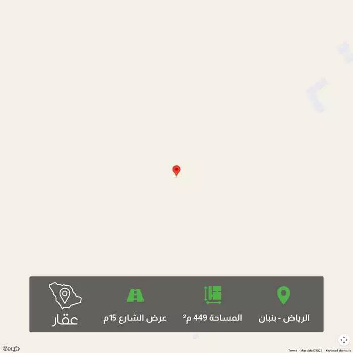 449 م² أرض في بنبان، الرياض معروضة بسعر ٦٠٠٬٠٣٥ ريال، أقل بنسبة 25% من متوسط سعر الحي البالغ ٨٠٤٬٥٦٢٫٥ ريال. بناءً على 944 عقار مشابه.