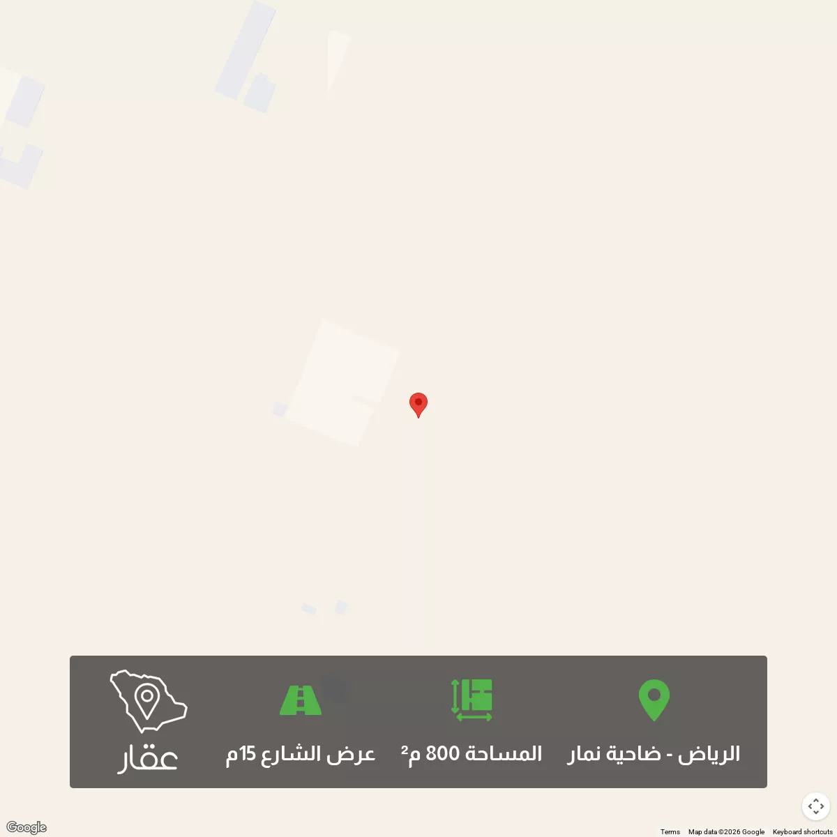 800 م² أرض في ضاحية نمار، الرياض معروضة بسعر ١٬٢٠٠٬٠٠٠ ريال، أعلى بنسبة 60% من متوسط سعر الحي البالغ ٧٥٠٬٠٠٠ ريال. بناءً على 439 عقار مشابه.