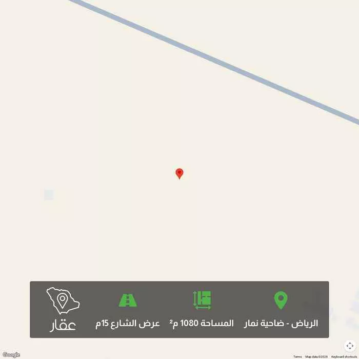 1080 م² أرض في ضاحية نمار، الرياض معروضة بسعر ٩٠٠٬٧٢٠ ريال، أعلى بنسبة 20% من متوسط سعر الحي البالغ ٧٥٠٬٠٠٠ ريال. بناءً على 439 عقار مشابه.