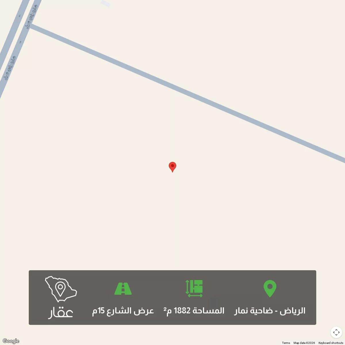 1882 م² أرض في ضاحية نمار، الرياض معروضة بسعر ٣٬٧٦٥٬٥٠٠ ريال، أعلى بنسبة 402% من متوسط سعر الحي البالغ ٧٥٠٬٠٠٠ ريال. بناءً على 439 عقار مشابه.