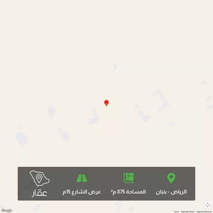 875 م² أرض في بنبان، الرياض معروضة بسعر ١٬٤٥٠٬٧٥٠ ريال، أعلى بنسبة 80% من متوسط سعر الحي البالغ ٨٠٤٬٥٦٢٫٥ ريال. بناءً على 944 عقار مشابه.