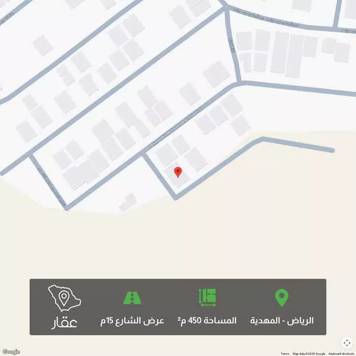 450 م² أرض في المهدية، الرياض معروضة بسعر ١٬٥٧٥٬٠٠٠ ريال، أقل بنسبة 13% من متوسط سعر الحي البالغ ١٬٨٢٠٬٠٠٠ ريال. بناءً على 371 عقار مشابه.