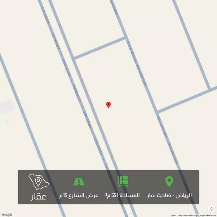 551 م² أرض في ضاحية نمار، الرياض معروضة بسعر ١٬٠٤٧٬٣٧٥ ريال، أعلى بنسبة 40% من متوسط سعر الحي البالغ ٧٥٠٬٠٠٠ ريال. بناءً على 439 عقار مشابه.