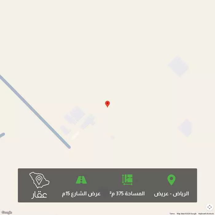 375 م² أرض في عريض، الرياض معروضة بسعر ٣١٨٬٧٥٠ ريال، أقل بنسبة 20% من متوسط سعر الحي البالغ ٣٩٩٬٦٠٠ ريال. بناءً على 653 عقار مشابه.