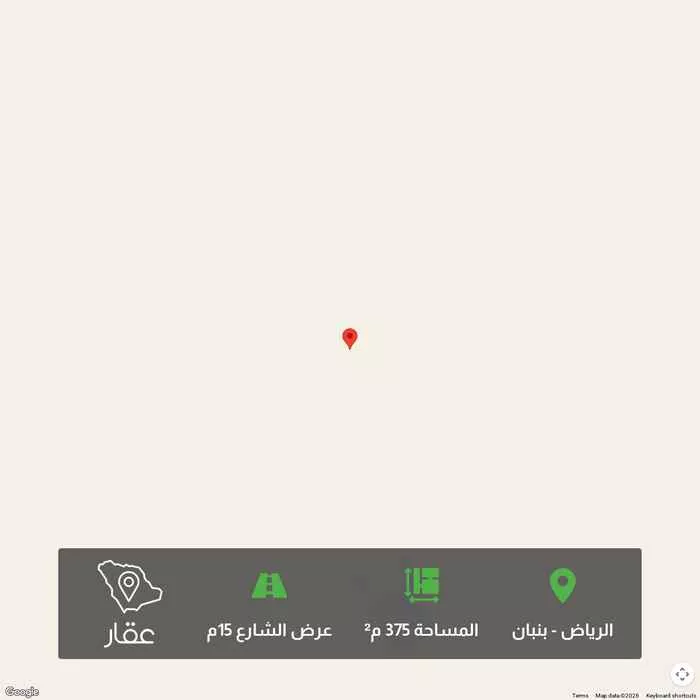 375 م² أرض في بنبان، الرياض معروضة بسعر ٥٢٥٬٠٠٠ ريال، أقل بنسبة 35% من متوسط سعر الحي البالغ ٨٠٤٬٥٦٢٫٥ ريال. بناءً على 944 عقار مشابه.