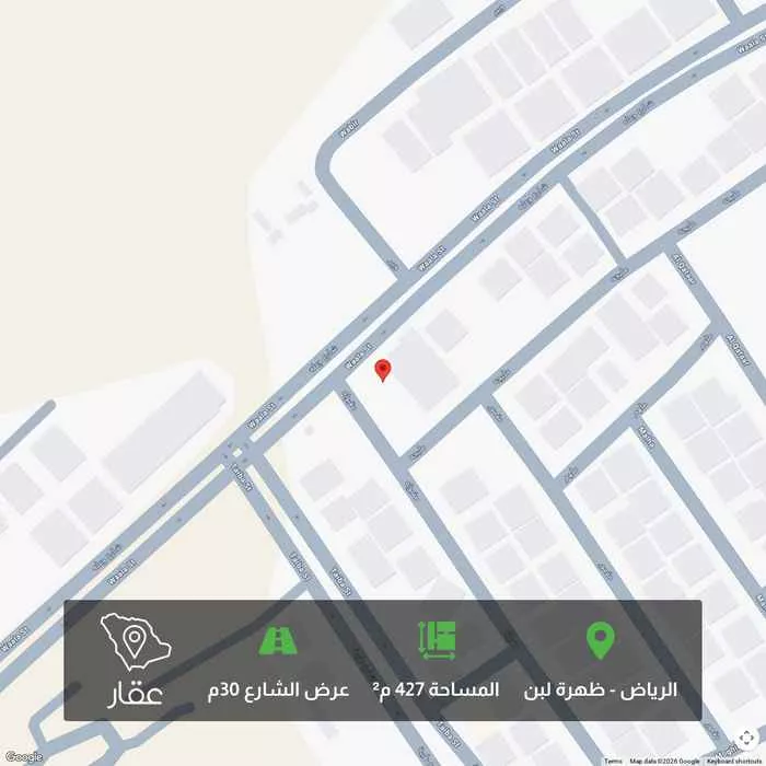 427 م² أرض في ظهرة لبن، الرياض معروضة بسعر ١٬٩٢٣٬٧٥٠ ريال، أقل بنسبة 22% من متوسط سعر الحي البالغ ٢٬٤٧٥٬٠٠٠ ريال. بناءً على 266 عقار مشابه.