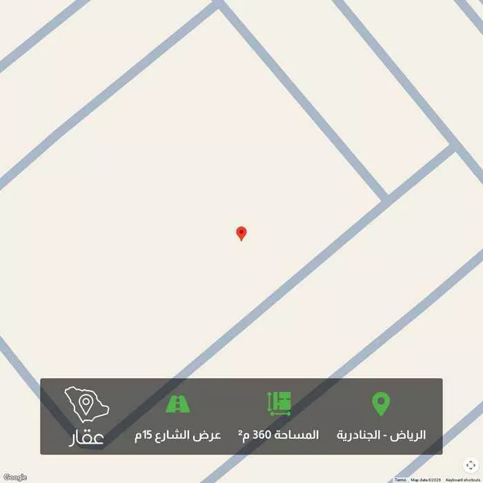 360 م² أرض في الجنادرية، الرياض معروضة بسعر ٩٠٠٬٠٠٠ ريال، أعلى بنسبة 16% من متوسط سعر الحي البالغ ٧٧٧٬٠٠٠ ريال. بناءً على 132 عقار مشابه.