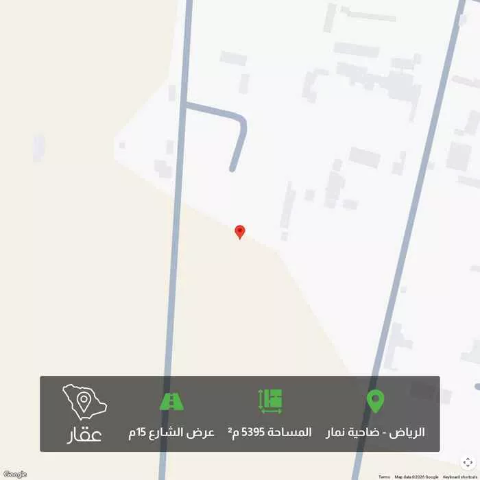 5395 م² أرض في ضاحية نمار، الرياض معروضة بسعر ١٬٣٤٨٬٧٥٠ ريال، أعلى بنسبة 80% من متوسط سعر الحي البالغ ٧٥٠٬٠٠٠ ريال. بناءً على 439 عقار مشابه.