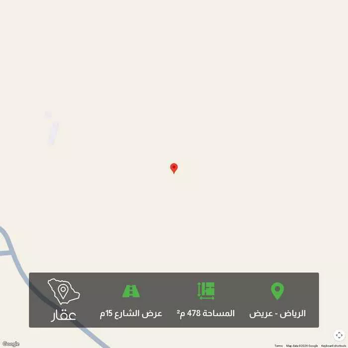 478 م² أرض في عريض، الرياض معروضة بسعر ٢٤٠٬٤٣٤ ريال، أقل بنسبة 40% من متوسط سعر الحي البالغ ٣٩٩٬٦٠٠ ريال. بناءً على 653 عقار مشابه.