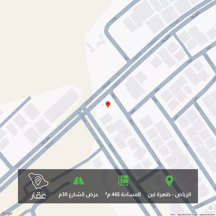 465 م² أرض في ظهرة لبن، الرياض معروضة بسعر ٤٦٬٥٠٠ ريال، أقل بنسبة 98% من متوسط سعر الحي البالغ ٢٬٤٧٥٬٠٠٠ ريال. بناءً على 266 عقار مشابه.