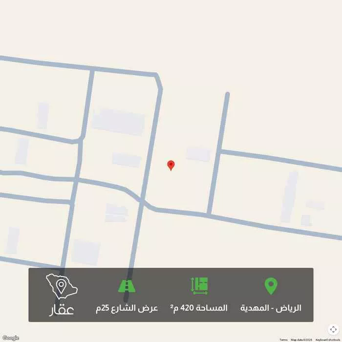 عرض على Aqarأرض للبيع الرياض _حي المهدية بين التقاطع الرابع والخامس المساحة 420م الشارع 25 الواجهة غربية رقم الاعلان 7100163554