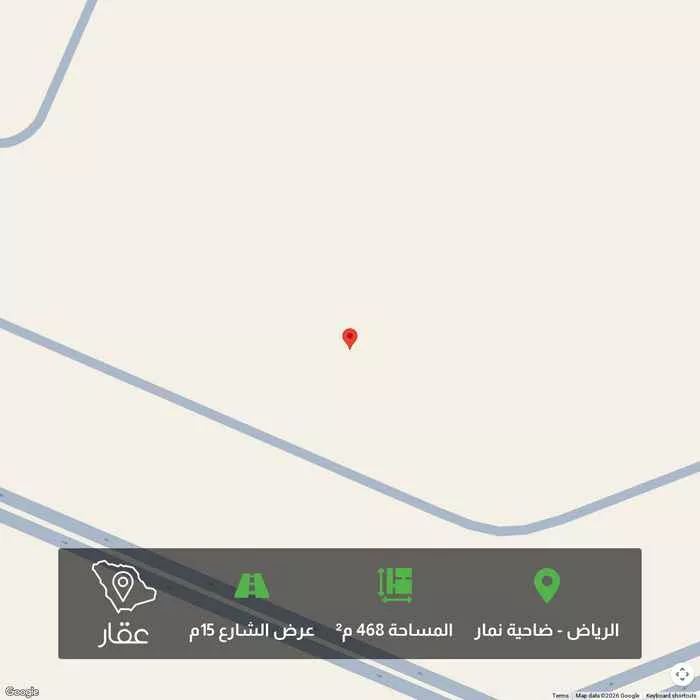 468 م² أرض في ضاحية نمار، الرياض معروضة بسعر ٤٥٠٬٢١٦ ريال، أقل بنسبة 40% من متوسط سعر الحي البالغ ٧٥٠٬٠٠٠ ريال. بناءً على 439 عقار مشابه.
